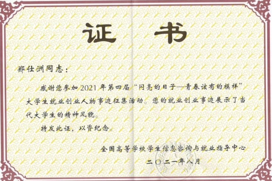 “闪亮的日子—青春该有的模样”老员工就业创业人物事迹征集活动分为校级选拔、省级推荐、国家级评选三个阶段。2021年5月,郑仕洲获评第七届“长江学子”,被省教育厅作为优秀代表推荐到全国参评,并最终入选全国基层就业人物事迹展,全省有5名老员工的事迹入选。