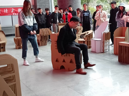 废弃纸板创意坐具设计大赛历时半个月,报名人数100余人,共收到参赛作品20余件。经过图纸评选、草模评比,共有18件作品、60余同学进入决赛。最终,由建筑系教师、辅导员组成的评委小组根据作品创意性、新颖性、设计性、技术性、市场潜力与实物制作精美度等多维度标准评选后确定名次。