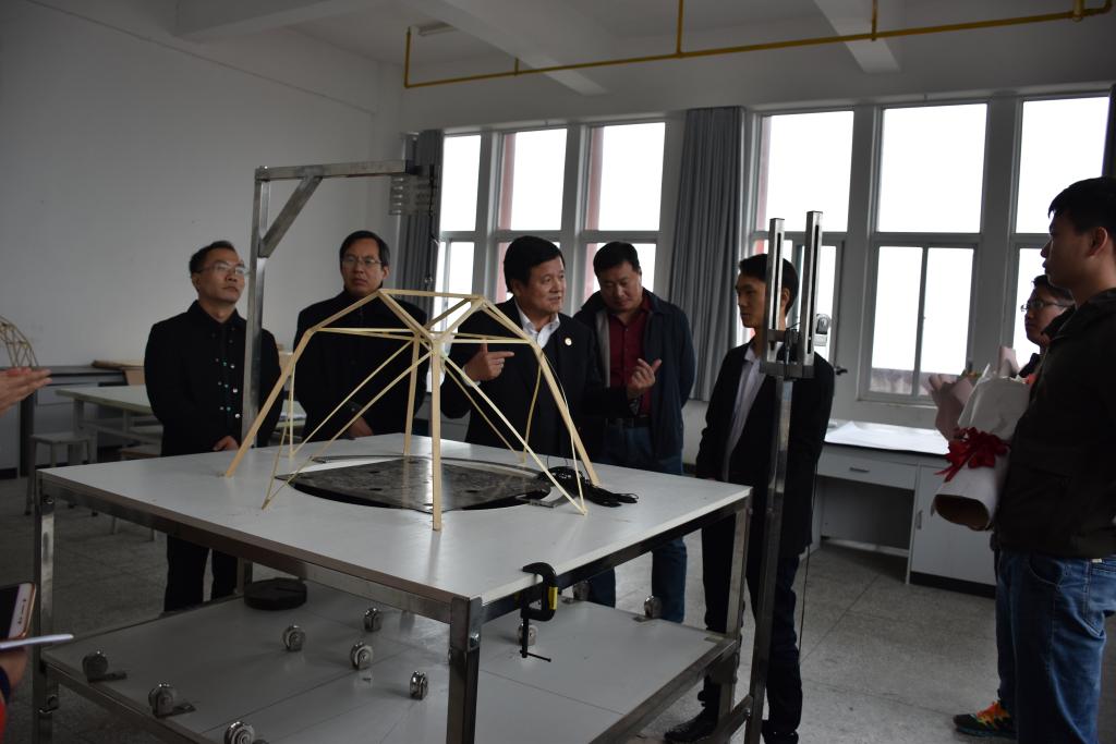 座谈会结束后,丁世学一行参观了实验室,观看了参赛模型,范建辉向丁世学介绍了比赛机制和参赛作品的结构与特色。