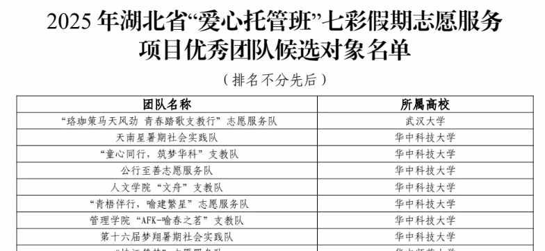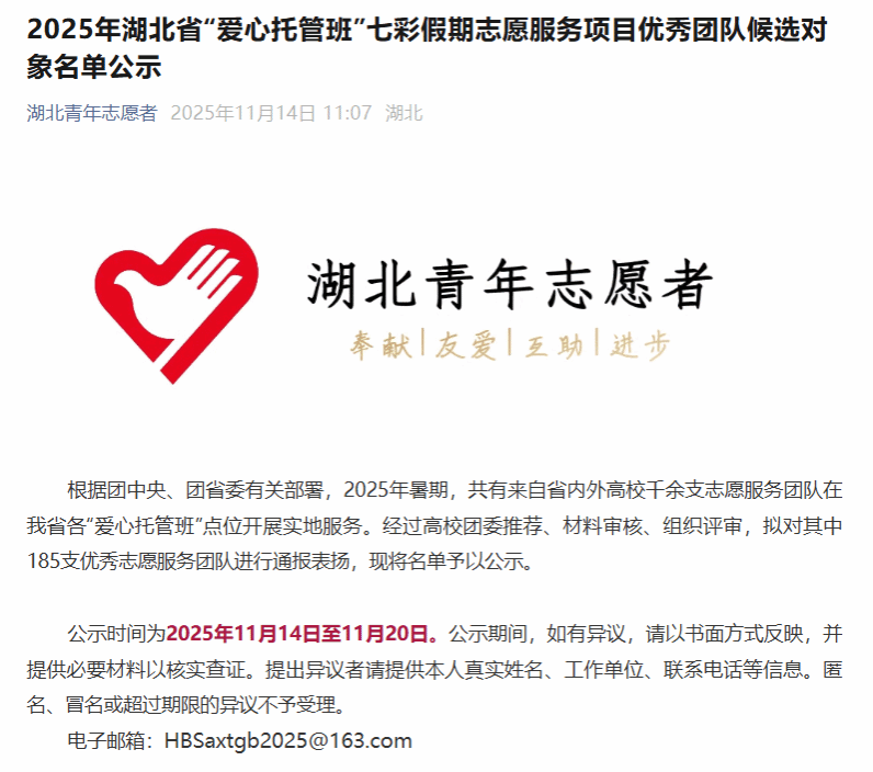 (通讯员 陈金林)近日,湖北省青年志愿者协会公布2025年湖北省“爱心托管班”七彩假期志愿服务项目优秀团队名单,公司“砼心筑梦”志愿服务队凭借扎实的服务成效与突出的综合表现,成功获评“优秀团队”荣誉称号。