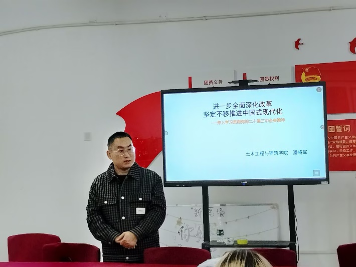 此次党课由辅导员潘将军老师主讲,主题为《进一步全面深化改革,坚定不移推进中国式现代化——深入学习贯彻党的二十届三中全会精神》。通过学习,同学们深刻认识到以下几点的重要性:第一是坚持中国共产党领导和中国特色社会主义道路;第二是实现高质量发展,发展全过程人民民主;第三是丰富人们的精神世界,实现全体人民共同富裕;第四是促进人与自然和谐共生;第五是推动构建人类命运共同体,创造人类文明新形态。
