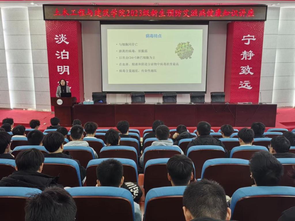 (通讯员 黄进 包筱雨)2023年11月21日晚上18:30,土建公司在逸夫图书馆三楼学术报告厅开展2023级新生艾滋病预防知识讲座,本次讲座由校医院汪琦医生主讲。公司2023级辅导员潘将军和全体2023级新生参加。
