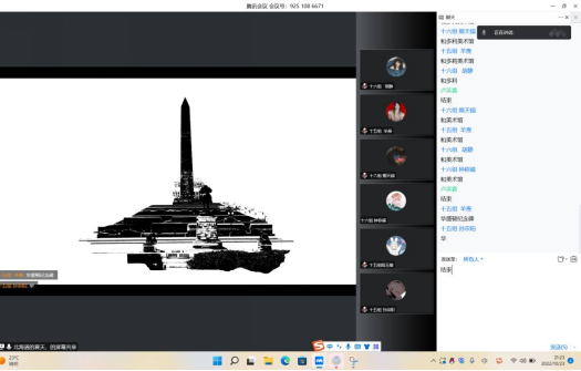 晚上8时,活动开始。参与比赛的二十个小组两两一轮,进行对决。每一支参赛队伍在相关负责人的主持下进入腾讯会议进行线上比拼。各个小组成员在活动的规定时间内,根据剪影积极抢答建筑物名称,努力为自己的小组赢得更高的分数。面对决赛中更加困难的题目,参赛选手们使出浑身解数,努力回忆备赛期间积累的知识,团队成员间也积极配合、相互提醒。在一番激烈的角逐过后,获奖名单终于揭晓。在本次活动中荣获一等奖的是第九组的参赛队员李祥什、李佳卉和唐子怡同学。