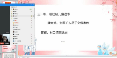 活动伊始,团员青年齐唱国歌,以爱国之声体现爱国之心。作为新时代青年,要时刻不忘初心﹑牢记使命,重温入团誓词再次使团员青年坚守入团初心。疫情期间,我们身边涌现出一批“战疫”青年典型﹑向上向善好青年,他们在各团支部的邀请下,为团员青年讲述跟党奋斗、战胜疫情的青春故事,体现他们在战胜疫情奋斗的过程中所展现出高贵的精神品格,激励团员青年见贤思齐,把对先进典型的敬仰和感动转化为勤学上进、干事创业、精忠报国的实际行动。