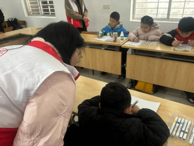 课间,小朋友们在志愿者的帮助下用手抄报的形式表达了对雷锋精神的感悟与敬意。