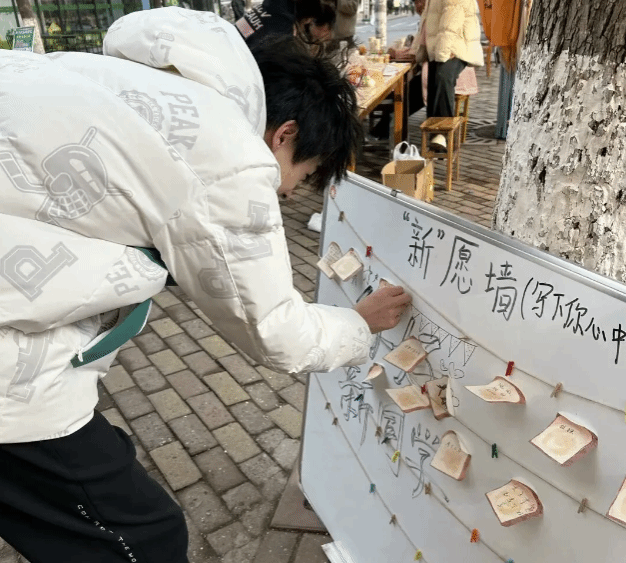 不光是17栋活动室里大家的欢声笑语,与此同时,楼下展台周围也挤满了一张张笑脸,大家拿着笔在展板上书写着自己的理想,志愿者们忙碌而有序地穿梭其中。展板上的空白逐渐被五颜六色的便签纸填满,那些文字汇聚在一起,如同一首激昂澎湃的梦想交响曲,奏响在展台周围,吸引着更多同学驻足、参与。