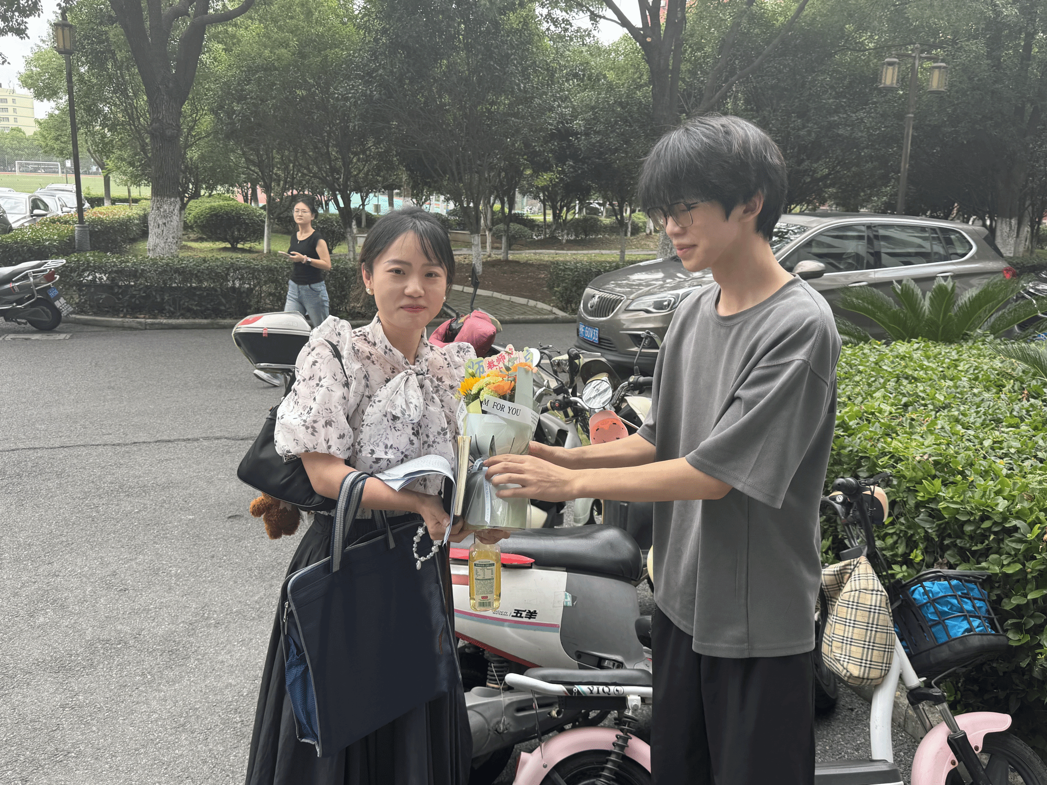 校园的林荫道旁,也留下了员工干部送花的暖心身影。当员工干部将鲜花献给老师时,老师手中的教案与文件,仿佛也因这份祝福而有了别样的温度。周围的绿树与车辆构成了宁静的校园图景,而这师生间的温情互动,成为了其中最动人的画面。