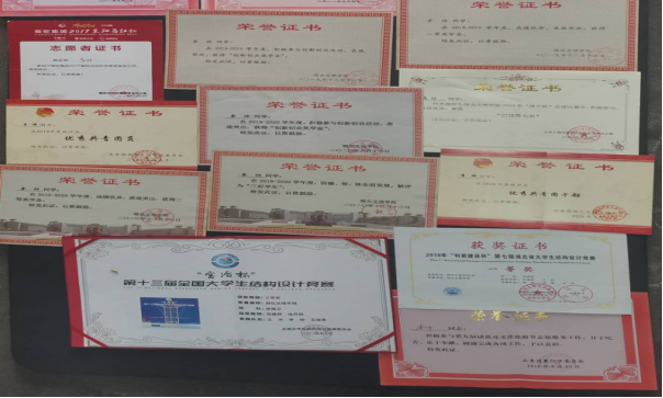 从步入校园开始,他就给自己定下了明确目标,他精细地规划着他的每一个时间节点。大一,他保持着高三的作息习惯,等到大二上学期结束时,一次性通过英语四级和计算机二级,综合素质测评班级第一;大二,他参加社团工作并参加校内各种竞赛,在省级刊物上发表了两篇论文。大二下学期,他参加结构设计比赛。他深知认真付出,才能无所畏惧,在比赛培训中日以继夜,不断钻研。量变最终质变,2019年10月,他和他的队友们喜得国赛三等奖,省赛一等奖。